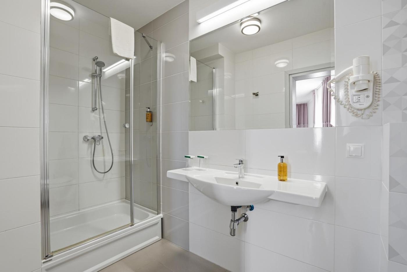 Każdy pokój w hotelu Bielany oferuje łazienkę z suszarką do włosów. Podłogi wyłożone wykładziną oraz drewniane meble nadają wnętrzom kameralną atmosferę.